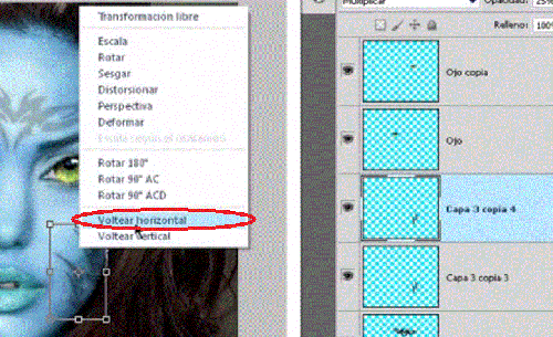 reducimos la opacidad de las dos capas a 25 % duplicaremos las dos capas para la mejilla de lado izquierdo con el boton secundario del mouse seleccionamos voltear horizontal