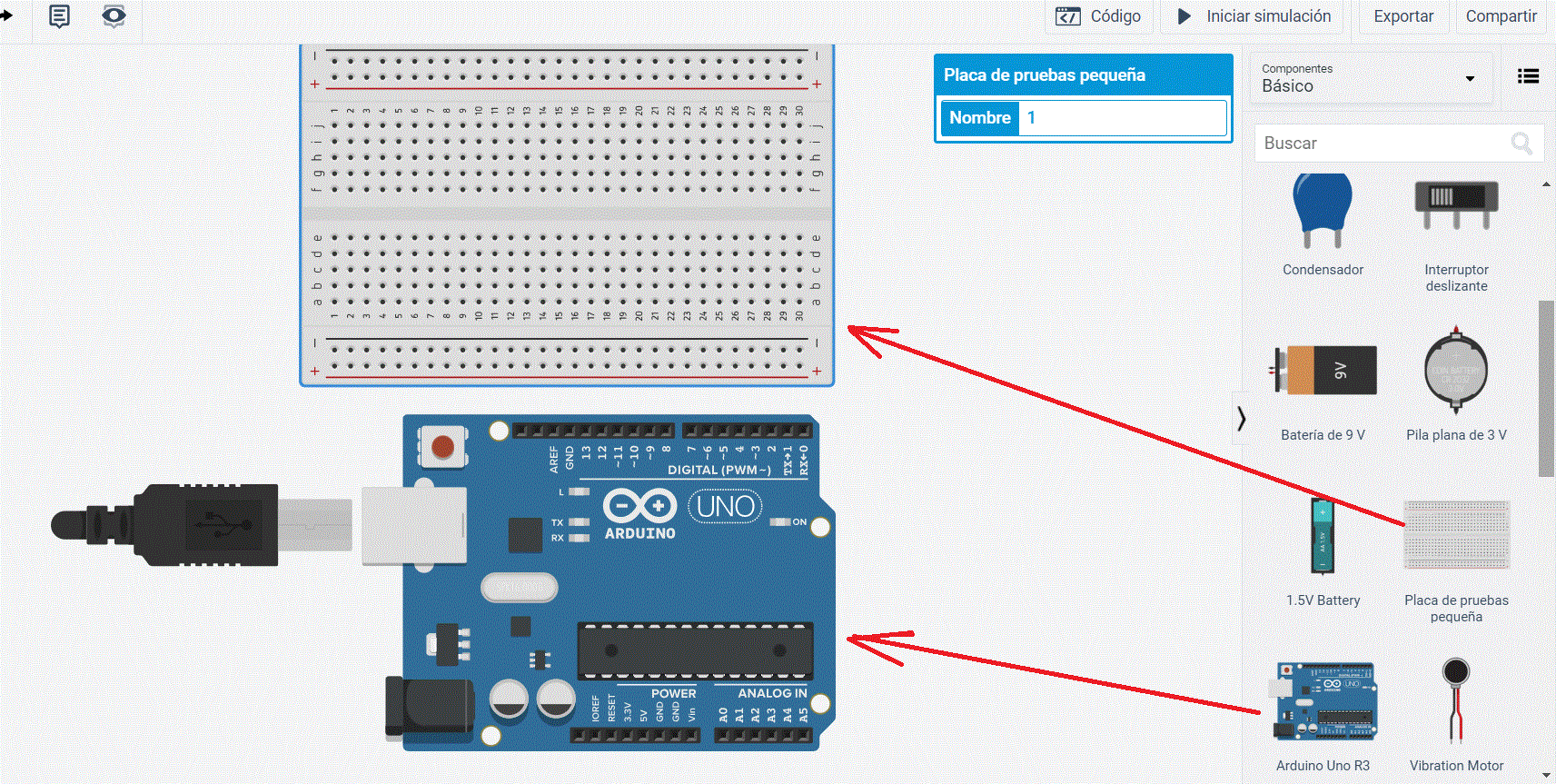 Vamos a colocar una Protoboard y una tarjeta Arduino