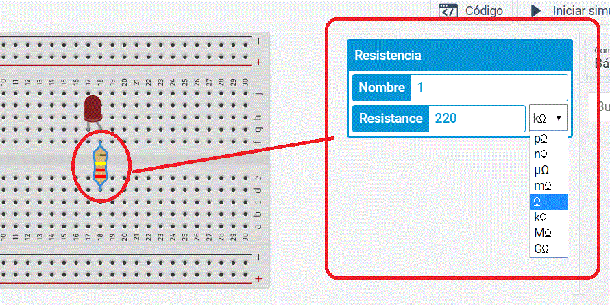 al colocar resistencias en la derecha en el cuadro azul podemos cambiar las caracteristicas y numero de ohmios en las resistencias