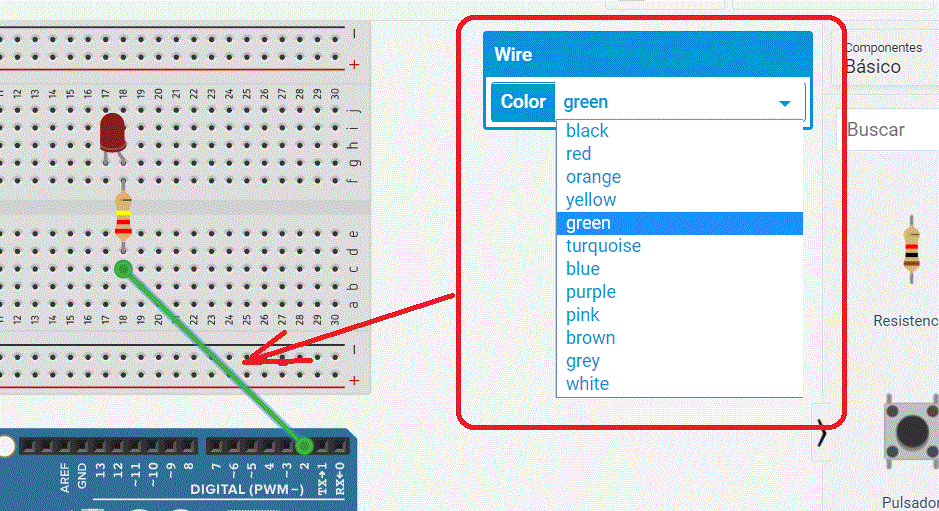 para cerar cables solo nos acercamos al pin o ala parte donde del protoboard que queremos conectar haciendo un click y otro click para hacer la conexion